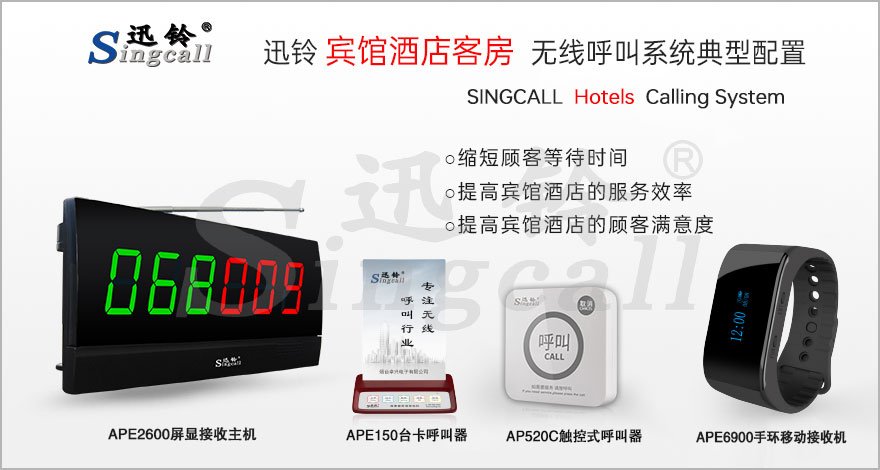 賓館酒店可以根據(jù)自己的實際需求及裝修風(fēng)格選擇產(chǎn)品,常用產(chǎn)品為APE2600屏顯接收主機、APE6900手環(huán)移動接收機和APE150臺卡呼叫器,APE520C觸控式呼叫器,更多產(chǎn)品搭配請點擊“