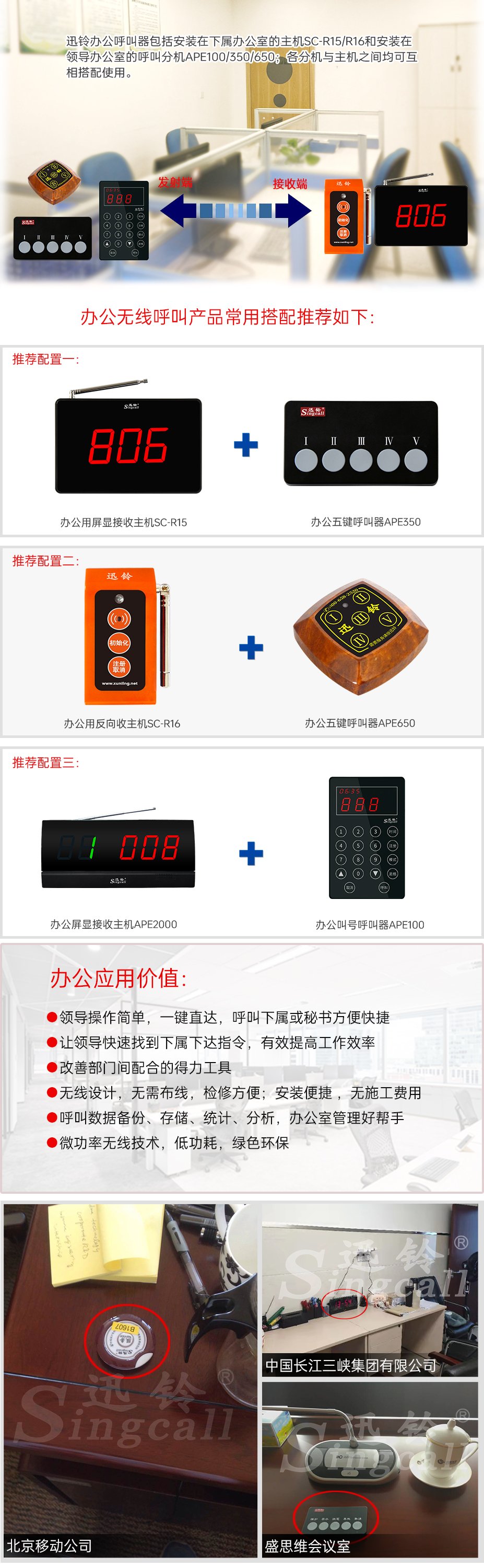 產(chǎn)品原理:領(lǐng)導(dǎo)按分機(jī)發(fā)射呼叫信號,辦公主機(jī)接收并語音播報(bào)呼叫信息