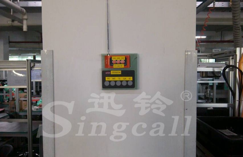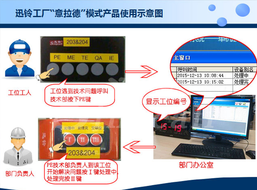 每?jī)蓚€(gè)工位共用一套呼叫器,包含一個(gè)APE830和APE350,其中APE350為車(chē)間工位工人呼叫使用,五個(gè)按鍵分別呼叫PE、ME、TE、QA、IE五類(lèi)相關(guān)人員。當(dāng)工位出現(xiàn)問(wèn)題,工人根據(jù)問(wèn)題的性質(zhì)分別按下對(duì)應(yīng)按鍵,通過(guò)主機(jī)APE2900播報(bào)呼叫信息,呼叫這五類(lèi)人員。APE830為被呼叫人員使用,當(dāng)被呼叫人員到達(dá)問(wèn)題工位,即可根據(jù)問(wèn)題解決進(jìn)程按下“處理中”按鍵,處理完后按下“處理完畢”按鍵。更重要的是該套系統(tǒng)與迅鈴的呼叫軟件相連接,軟件可以記錄工位呼叫信息與問(wèn)題解決進(jìn)程情況,管理者可以通過(guò)軟件清楚的了解工位的問(wèn)題解決情況,即何時(shí)開(kāi)始解決,何時(shí)解決完畢,以監(jiān)控工作效率。