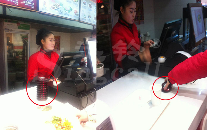 4. 餐點(diǎn)做好后,服務(wù)員通過前臺放置的SC-T180發(fā)射器呼叫相應(yīng)的小飛盤號碼;