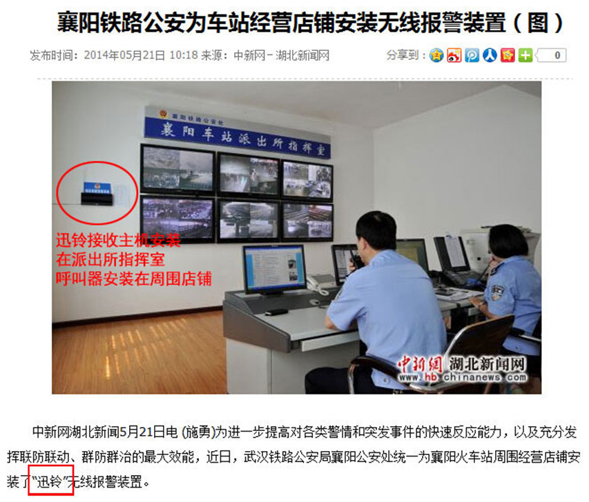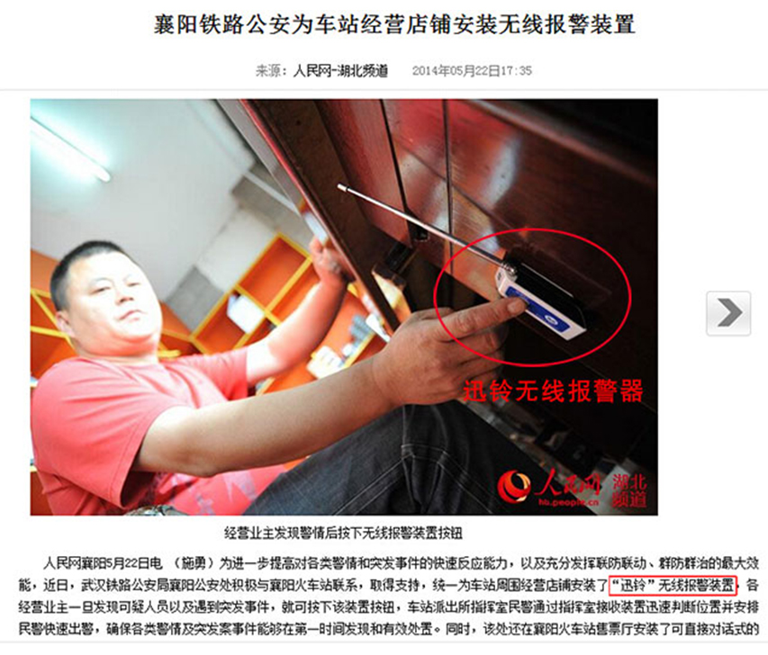 近日,中新聞報道了襄陽鐵路公安為車站經(jīng)營店鋪安裝了“迅鈴”無線報警裝置。