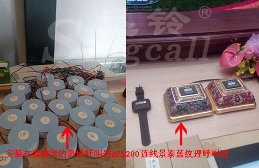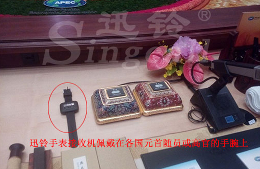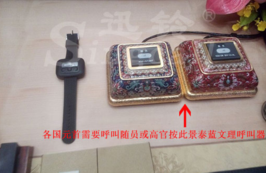 APEC期間,迅鈴是這樣發(fā)揮作用的:將編好號(hào)碼的迅鈴呼叫器APE200放置在會(huì)議的警衛(wèi)監(jiān)控室,通過外接線與會(huì)議室桌上特殊定制的景泰藍(lán)紋理呼叫按鈕相連 ,并通過二次開發(fā),與警衛(wèi)監(jiān)控室的LED屏相連。每位國(guó)家首腦的桌位放置兩個(gè)呼叫器,分別呼叫各自的隨員與高官兩類工作人員。與此同時(shí),各國(guó)首腦對(duì)應(yīng)的隨員與高官手腕上配戴迅鈴無(wú)線可移動(dòng)接收主機(jī)APE6600 。各國(guó)首腦開會(huì)期間,隨員和高官兩類人員在會(huì)場(chǎng)外隨時(shí)待命,各國(guó)領(lǐng)導(dǎo)人在會(huì)議期間有任何事務(wù)需要或是發(fā)生特殊情況,只需按下手邊的呼叫器,就可同步呼叫對(duì)應(yīng)的隨員或是高官。收到首腦的呼叫信息后,隨員高官手腕上的接收腕表與LED屏同時(shí)顯示呼叫號(hào)碼,被呼叫人員需要到警衛(wèi)室,與警衛(wèi)安保人員核對(duì)呼叫號(hào)碼,號(hào)碼一致方可進(jìn)入。本套呼叫應(yīng)答設(shè)備的使用,可以實(shí)時(shí)解決會(huì)議期間的問題,并進(jìn)一步加強(qiáng)了會(huì)議的安全性,保證會(huì)議順利無(wú)障礙進(jìn)行。